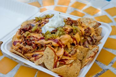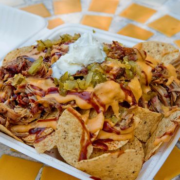 Pulled pork or chicken topped with cheese sauce, cowboy beans, wicked pickles and pickled onions. BOOM!!